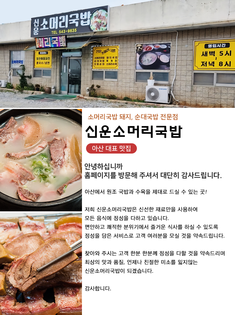 신운소머리국밥 | 주소: 충남 아산시 영인면 영인로 350 1층 | 대표번호 : 041-543-9635 | 사업자번호: 367-55-00640 | 대표자: 김난영